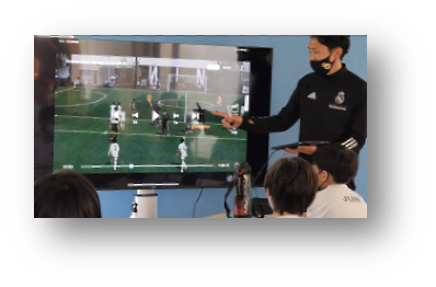 レアルではオフ・ザ・ボールと呼ばれる、「ボールを持っていない時間に何をするか」をとても大事にしているのですが、AIカメラの「上から俯瞰した映像」を使うことで、スクール生はピッチ上の自分の目線とは異なる視点で、客観的に見た自らの動きや距離感を理解することができます。