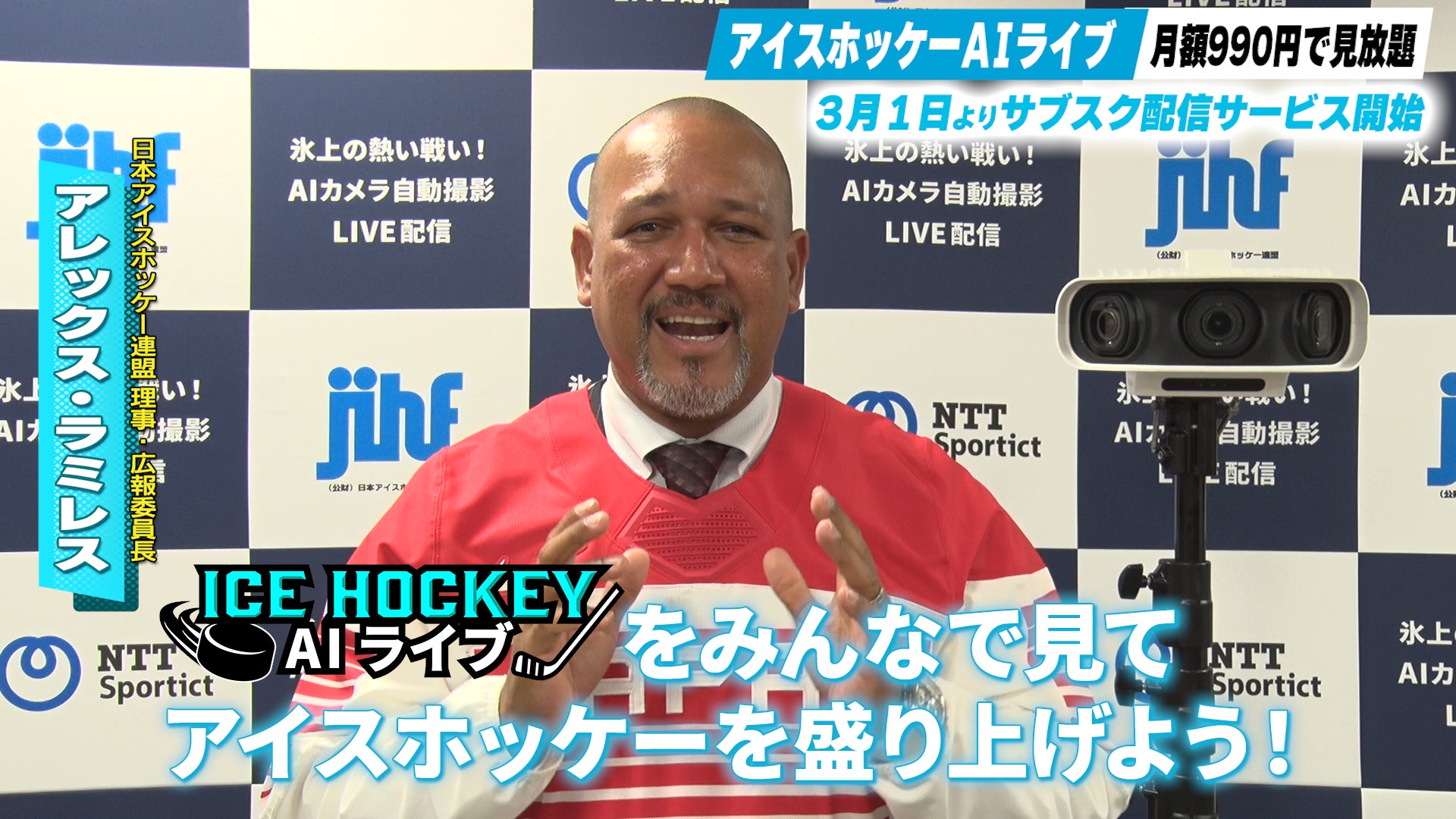 発表会には元プロ野球選手・監督で現在は日本アイスホッケー連盟理事・広報委員長に就任されているアレックス・ラミレス氏をお迎えし、フルリモートマルチアングル配信を体験していただきました。また、アイスホッケー界が今後ますます盛り上がっていくためのメッセージも頂戴しました。