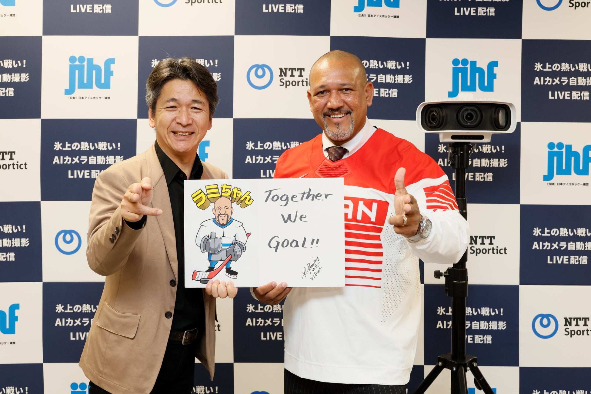 その後、ゴールを決めた選手にぜひ実践して欲しいと「アイスホッケー版ラミちゃんポーズ」も考案。NTTSportict代表取締役社長中村正敏と共に「ゲッツ!」を披露し、会場を湧かせました。